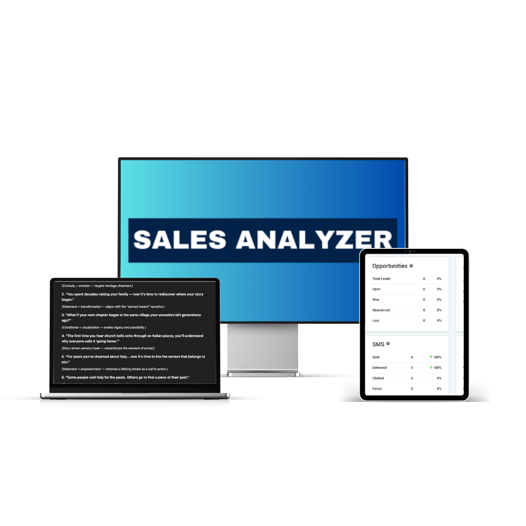 This is a plug-and-play close with the Sales Analyzer for timestamped fixes, and done-for-you emails/SMS to move deals forward so you close more and earn more using the calls you already take.