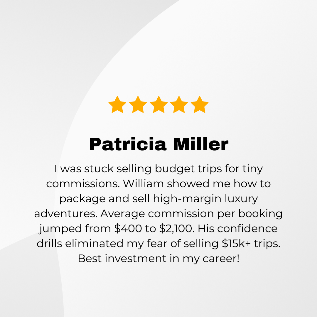 Most “sales trainings” give you frameworks and hours of video. Travel Sales Accelerator is a plug-and-play close: the verbatim 3-Buckets script, 90-second micro-designs, same-call fee links, and follow-ups you can use today. Built by a 100-year agency and used by 100+ advisors, it raises close rate and commission without changing your process or adding call time plus monthly roleplay and a Sales Analyzer to keep improving.